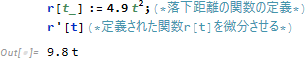 Mathematica が正解を出力するのは、微分公式を記憶済みだからに過ぎない。具体的に落下公式の r(t) = 4.9t2 を微分するならば、先ほどの式に「当てはめて」、 n = 2 と、a = 4.9 を代入し四則演算すればよいが、それさえも Mathematica にまかせればよい。