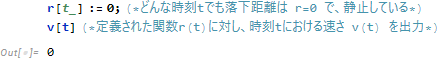 例2:時刻 t = 1s (=1秒) における距離は r(0) = 4.9 × 1 × 1 = 4.9 と正解が出る。つまり落下距離 4.9m (=4.9メートル) と分かる。