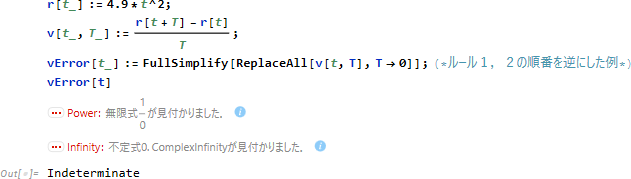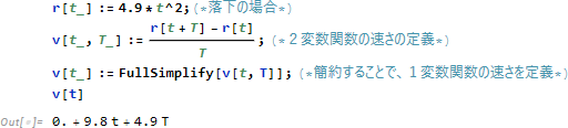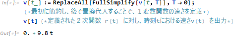 と表記する。表記としても、変数 T が消えて、めでたく1変数関数 v(t) になっている。ただし、瞬間 T を具体的な定数 (数値) として表現することはしない。むしろ瞬間 T は、「最初は T ≠ 0 で簡約化 (FullSimply) し、最後は T = 0 を置換代入 (ReplaceAll) 」という新演算の中にこそ数学的に表現されることになる。