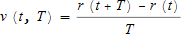 と書くことが出来る。この分子も差分であり、Δ r = r(t+T) – r(t) = r(t+Δ t) – r(t) となる。ゼロ時間 (つまり同時刻) における差分が 0/0 を生み出したことを考えると、速さ