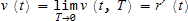 ここで、もともと任意の値を入力可能な変数であった測定時間 T を、瞬間に定めてしまうために、2変数関数 v(t, T)が1変数関数 v(t) になる。この操作を高校数学では「T を0に近づけ (T → 0)、極限 (limit) をとる」と表現し、