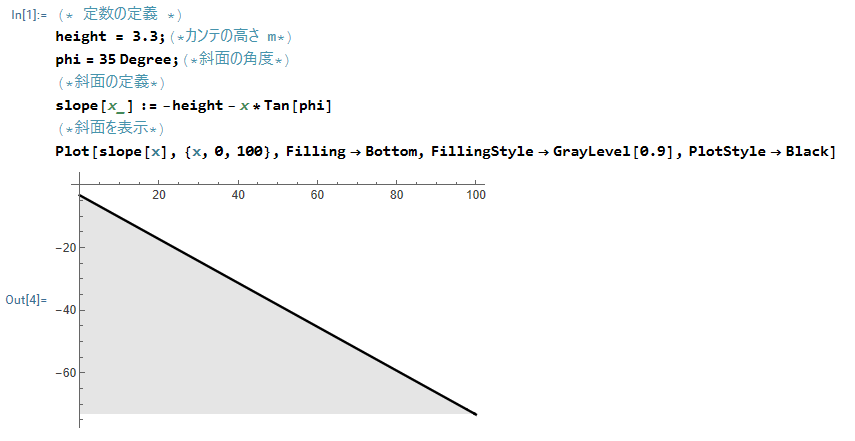 また、カンテ(踏み切り)の高さは3.3mであるそうですので、ジャンパーが飛び出す位置を原点(0,0)とし、(0,-3.3)の位置から35度の斜面があると設定します。
