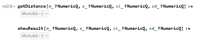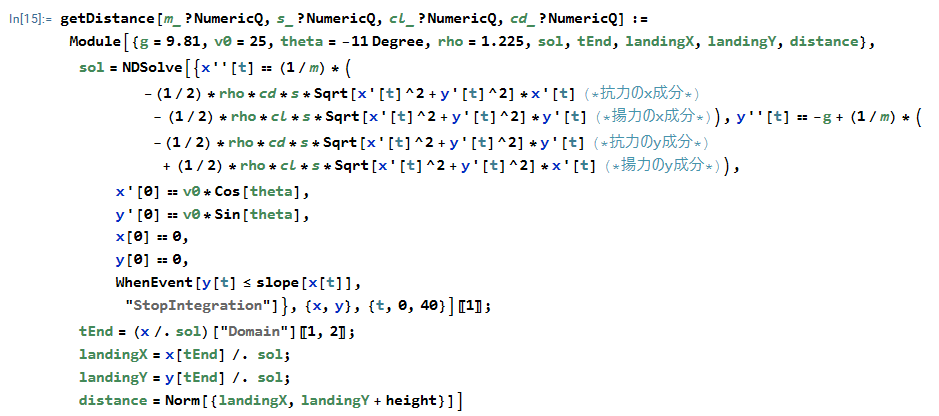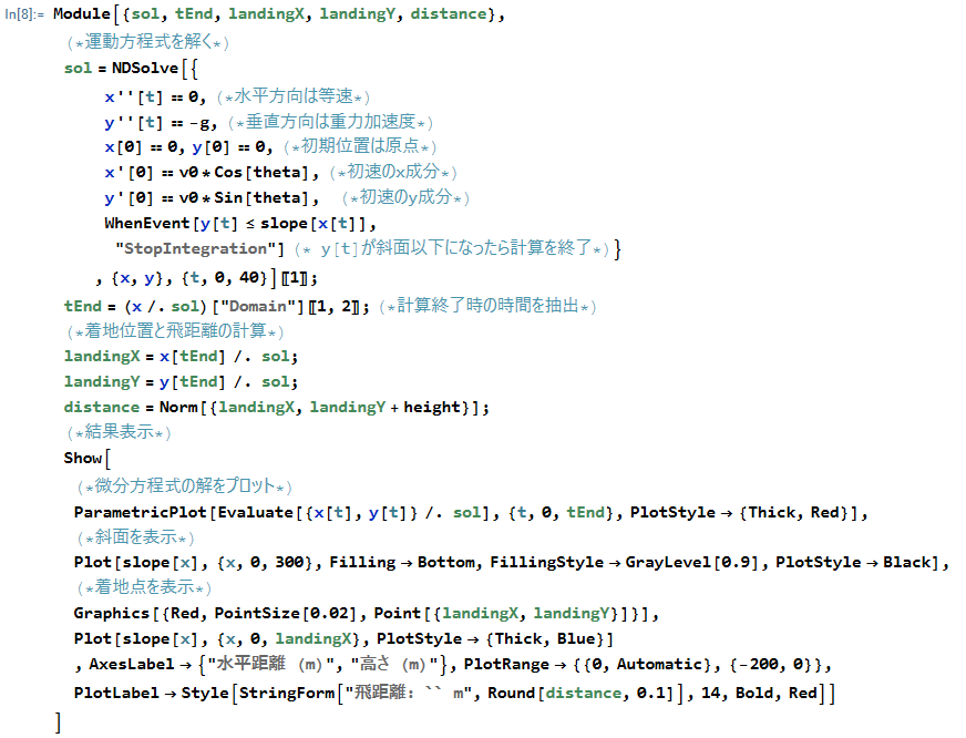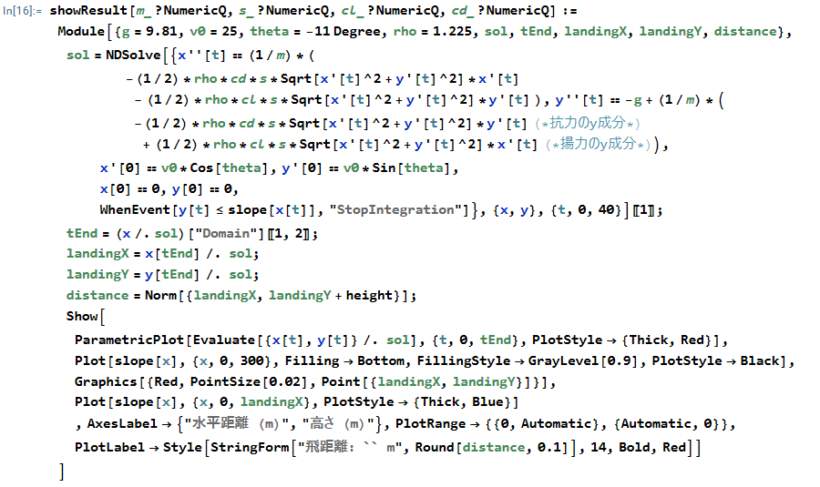 まずは、パラメーターの変化に伴う結果をすぐに取得できるようにするために、それぞれの変数を引数に取って飛距離を求める関数と結果を表示する関数を作成します。