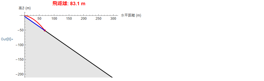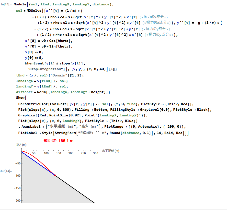 ですが、2月に幕を閉じたミラノ・コルティナ冬季オリンピックのスキージャンプを見ていて、空気抵抗が飛距離に影響を与える様子を見て、空気抵抗を考慮して運動方程式を立てるとどうなるかが気になったため、今回はスキーのジャンプの飛距離をMathematicaで計算できないか試してみました。