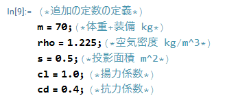なお、定数についてはAIの回答を参考にして、投影面積はs=0.5 (\(m^2\))、抗力係数、揚力係数はそれぞれcl=1.0、cd=0.4とします。