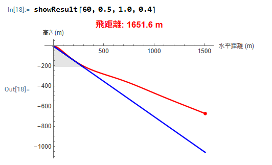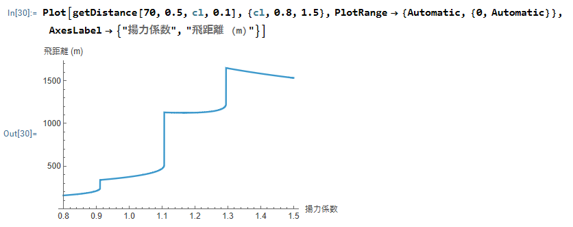 抗力係数を0.1としたときには、0.912、1.107、1.295を境に飛距離が大きく変わるようです。