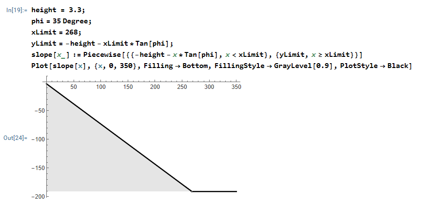 大倉山ジャンプ台では全長368.1m、ブレーキングトラックは100mのため、斜面の関数を268mまでは斜度35の斜面、それ以降は水平になるように定義しなおします。