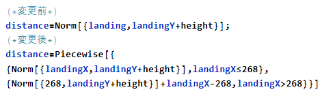 また、今までは飛距離の計算を(0,-3.3)から着地点までの直線距離として求めていましたが、これを上記の修正に伴い変更します。