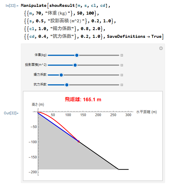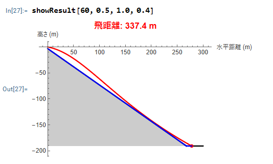 実際にはジャンプ中にジャンパーの姿勢が変わることにより、投影面積や揚力/抗力係数なども変わってきますので、まだ現実に即した値からは遠いと考えられますが、空気抵抗を考慮した物体の投射運動としては思っていたよりもしっかりと計算できたのではないかと思います。
