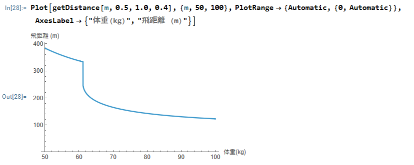 この設定を使って再度体重の変化に伴う飛距離を計算してみます。