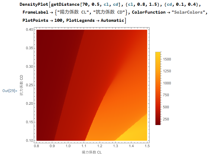 続いて揚力と抗力の変化に伴う飛距離の変化についても可視化してみます。