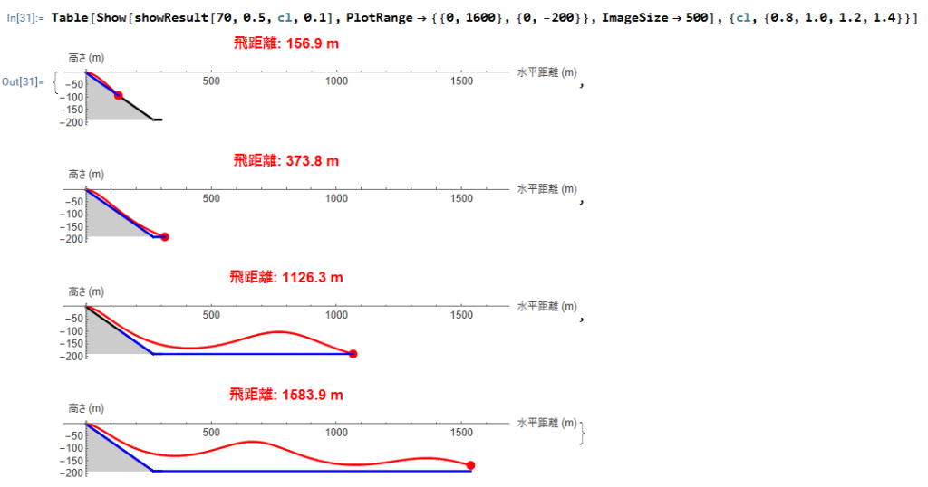 水平距離で200m付近で一度地面に近づきますが、そこを超えると地面から離れるようになっており、t=40になっても地面に着地していないことが分かりました。この条件では、m=61.2以下の時に滑空状態になるようです。