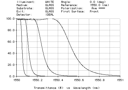 The plot below shows the performance of the four designs. Note, interestingly, that for each coating in the series, the bandwidth is approximately halved — exactly what each new WDM generation requires.