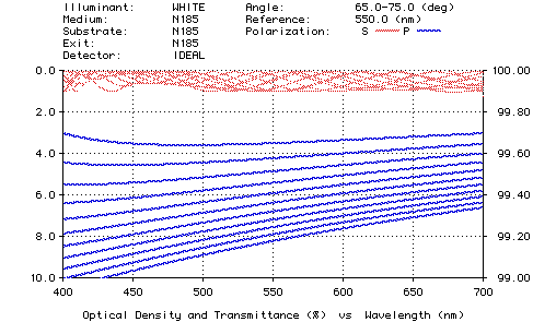Although the authors do not give the exact details of the coating design, it is possible to use TFCalc to create such a polarizer. Here we design a polarizer for 400-700 nm to operate for the angles 65-75 degrees in the prism. This design requires a high-index glass prism. An index of 1.85 is used in this design. This means that the range of angles in air is ア9.28, which is considered wide-angle. We use the following 22 continuous optimization targets: