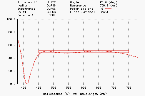 We are required to design an immersed beamsplitter all of whose layers are dielectric and symmetric. An N-layer design is symmetric if layer number i is the same material and thickness as layer number N-i+1. The coating is immersed in glass (index 1.52) and must operate in the wavelength range 450-750 nm at 45 degrees. It should transmit 50% of S-polarized light. There is no requirement for P polarization.