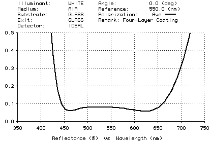 The graphic below shows the performance of a 4-layer design that reduces the reflectance of glass from its usual value of about 4% down to less than 0.1%.
