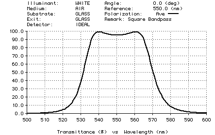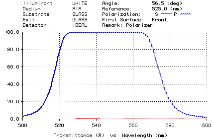 The graphic below shows the performance of a 40-layer polarizing beamsplitter which performs quite well from 525 to 565 nm. Note that the S polarization is very close to zero in the entire 500-600 nm region. This non-traditional design was created with the needle optimization method.