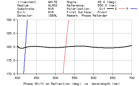 The graphic below shows the performance of a 180-degree phase retarder using total internal reflection to reflect 100% of the beam. It is assumed that the mirror is coated on the hypotenuse of a right prism, so that the incident medium is glass and the exit medium is air. Note: The Abeles phase convention is used.