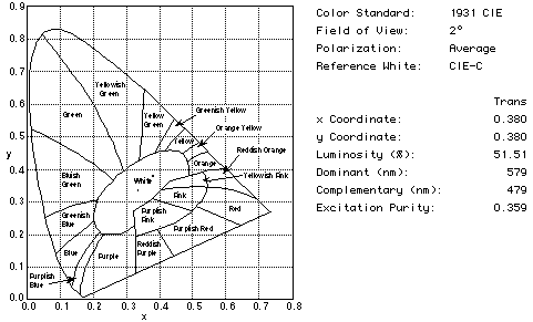 TFCalc can design coatings that control the color of transmitted or reflected light. For example, the graphic below shows how a 2800K source was corrected to transmit light having an (x,y) color of (0.38,0.38). The coating consists of 6 layers of SiO2 and TiO2.