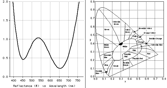For broadband coatings in the visible part of the spectrum (wavelengths 380 to 780 nm), the color of reflected and/or transmitted light may be important. As an example, consider anti-reflection coatings for eye glasses, which usually have a green reflection. A four-layer coating can reduce the luminous reflectance to 0.1% and have a reflected color of x=0.3, y=0.4. However, as the plot below shows, if we have even a small manufacturing error, the color of the reflected light varies considerably.