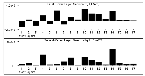 To understand this graph, there are two cases to consider: (1) When the analysis is done on a completely optimized design, the first-order sensitivity is very close to zero. In this case, the second order sensitivity tells how steep the sides of the “valley” are. Layer 14, with a second-order sensitivity of about 0.002, is clearly the most sensitivity layer. So if the thickness of layer 14 is changed by dX nm, then the merit function increases by 0.002 dX^2. (2) When the analysis is done on a design that is not completely optimized, then the second-order sensitivity is undefined because we are not at the bottom of a “valley”. In this case, the first-order sensitivity shows how the merit function increases or decreases when a thickness changes; if Q is the first-order sensitivity of a layer and dX is the thickness change of that layer, then the merit function changes by Q dX.