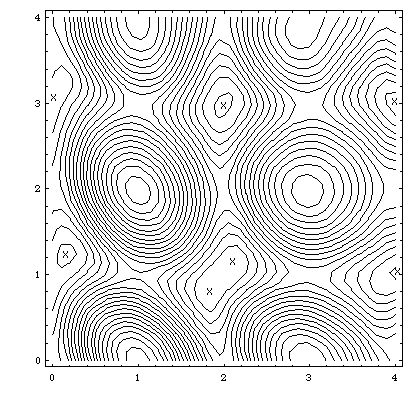 In general, there are many coating designs that minimize the merit function. For example, the contour plot below shows the merit function for a two-layer coating design. The X’s mark where the merit function has minimum values.