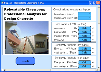 建築シミュレーションと解析ツールは広く利用されています。しかし、これらのツールの価値は、設計者が豊富な可能性の中からより良い解決策を見つけるのに実際に役立つかどうかによって決まります。設計者がどのように建築コストと環境影響の設計トレードオフの解空間を操作するのかを検証するため、 CIFE の研究者たちは総合的な実験を構築しました:設計チームは予算内で最もエネルギー効率のよい再配置可能な教室を設計することに挑戦したのです。設計チームは断熱材の厚さ、窓の種類、屋根材などの初期コストと環境影響間のトレードオフに影響を与える 6つの設計に関する決定をする必要がありました。それぞれの決定には、2つか 3つのレベルの性能とコストがあり、結果として 486通りの設計の組み合わせになりました。2つのタイプのグループに学生たちを分けてテストしました。一方のグループの学生設計者は、シミュレーションを平均した各設計パラメーターの費用対効果の良い「重要性」の結果を受け取りました。もう一方のグループは、より伝統的なモデルベースの設計解析プロセスに従いました。設計者はサステナブルデザインについての知識が少ない修士レベルの学生でした。各グループの設計解析はステップ・バイ・ステップで追跡され、単一の評価値に対して評価されました。