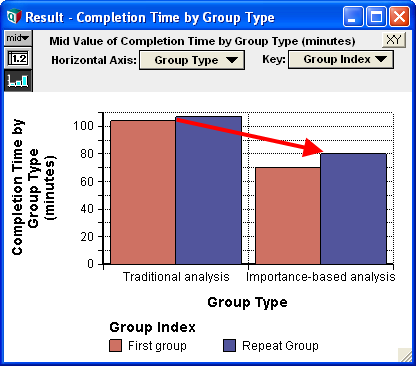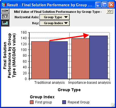 中間結果では、「重要性」の情報を与えられた設計チームの方が、もう一方のチームより解空間への進み方に着実な進歩があったことが示されています。「重要性」は、性能と各パラメーター間の順位相関を使用する各設計パラメーターの建物性能の感度の評価基準です。