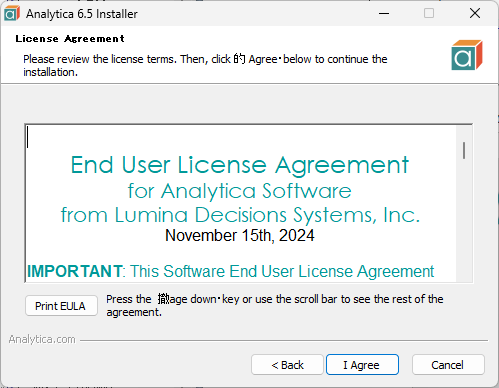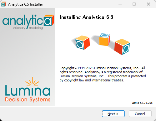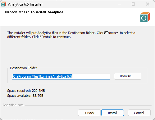 インストール先:Analytica のデフォルトのインストール先は、C:\Program Files\Lumina\Analytica 6.x に設定されています。
