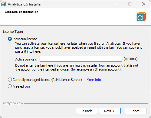 Individual license: (最も一般的な選択) 個人購入により発行されたアクティベーションキーをお持ちの場合に選択します。システム管理者の方で、インストーラーを実行するのとは別のアカウントのユーザーために Analytica をインストールする場合もこのオプションを選択しますが、Activation Key 欄は空白のままにしてください。アクティベーションキーは、Analytica を実際に使用するユーザーが入力します。Activation Key 欄に空白にした場合、Analytica の次回以降の最初の起動時にアクティベーションキーを入力するよう要求されます。