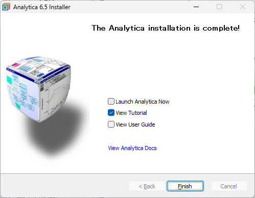 インストールが完了しました。続けて起動する場合は、Launch Analytica Now にチェックを入れて Finish をクリックしてください。