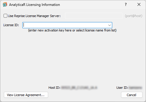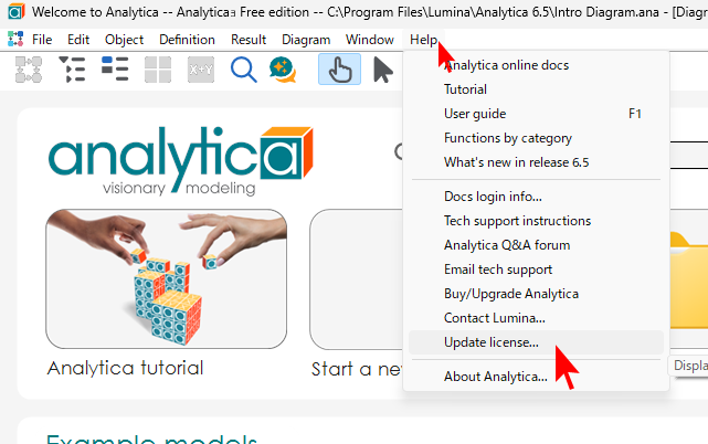 Analytica が起動します。もし、インストールの途中でプロダクトキーを空白にしていた場合は、以下のようなダイアログが表示されます。メールで送付された License ID (またはドロップダウンメニューから free edition を選択) を入力してください。このダイアログはプログラムを起動した後に Help → Update License から表示できます。