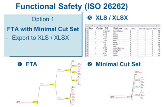 単一点故障と二点故障が定性分析で決定される場合、故障ツリーのミニマルカットセットを確立することができます。通常、評価分析は単一点故障と二点故障に対する外部ドキュメント内の他のコンテンツを使って行われます。必要とされるデータはミニマルカットセットをエクスポートすることで適切なフォーマット (MS Excel 等) に転送することができます。