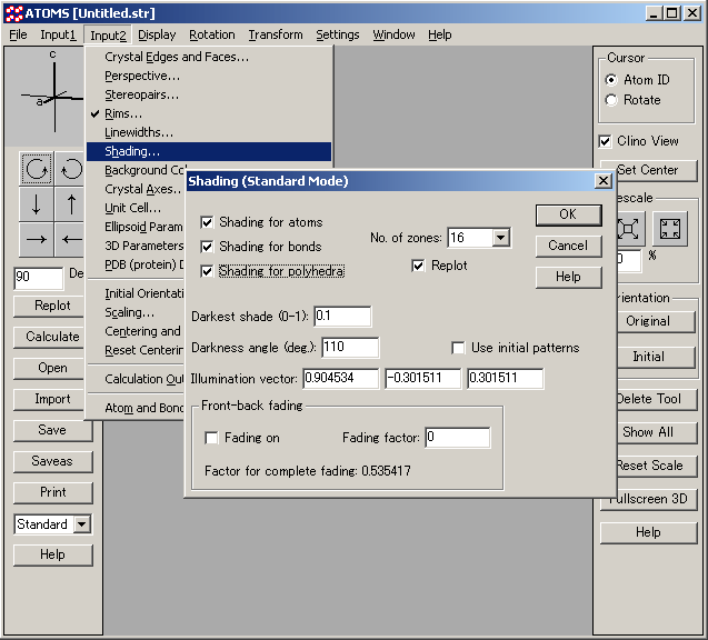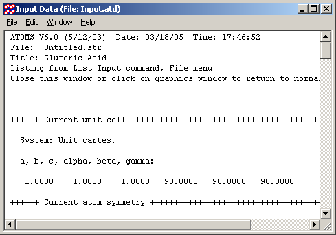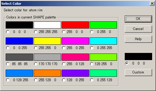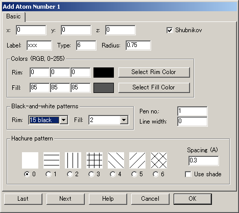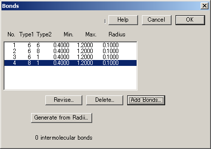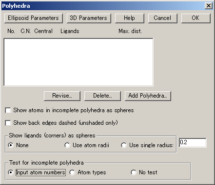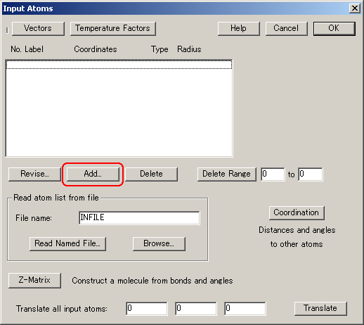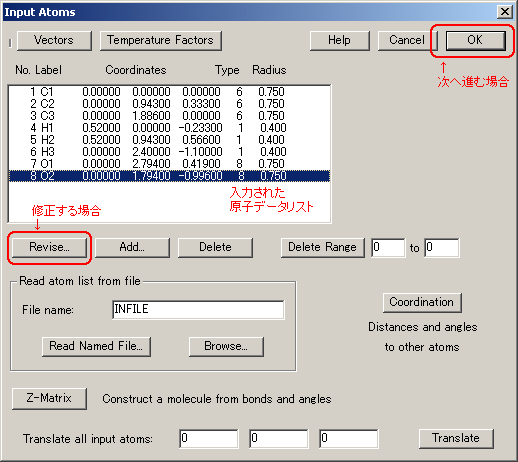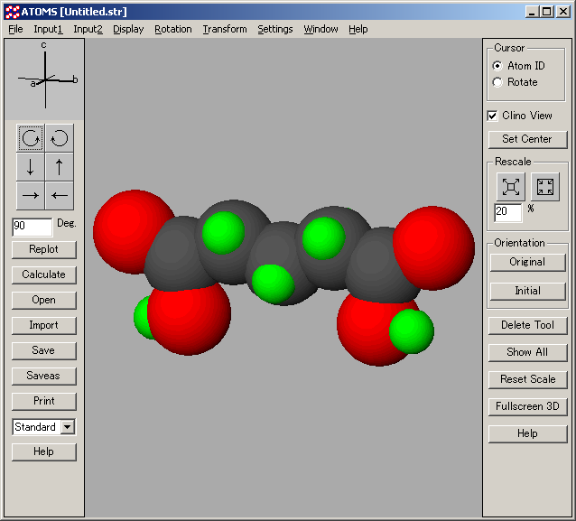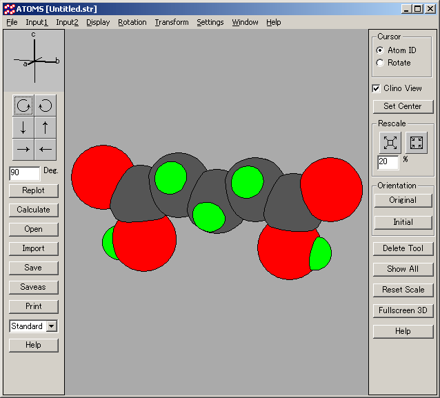ここでは、原子データと結合データの基本的な入力方法と、相互貫入する原子の空間充填形式での表示方法を説明します。(原子位置と半径のデータは即席で用意したもので、現実のものではありません。)