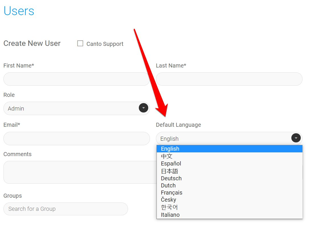 新規ユーザーアカウント作成時に、ウェルカムメールのデフォルト言語を設定することができます。ウェルカムメールはデフォルト言語で送信されます。