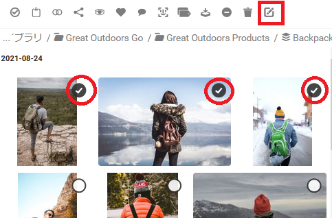 - アセットを選択すると、右上のツールバーに一括編集のアイコンが表示されます。