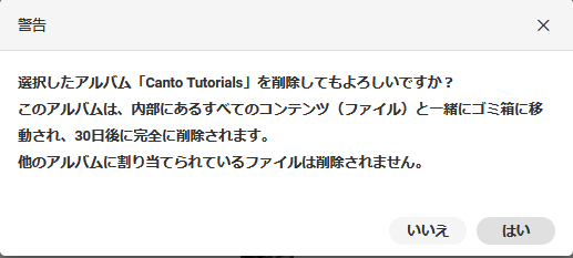 フォルダーやアルバムを削除することができます。フォルダーを削除すると、そのフォルダーに含まれるすべてのアルバムとサブフォルダーも削除されます。