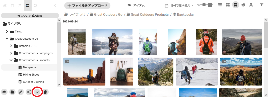 注記:Canto のデフォルトでは、フォルダー内の複数のアルバムに関連するファイルは、その都度別ファイルとしてカウントされます。ただし、このデフォルトを変更して、ファイルがいくつのアルバムに割り当てられていても、1回だけカウントされるようにすることができます(設定 > 設定オプション > デフォルト > その他のオプション > フォルダー&アルバム数)。