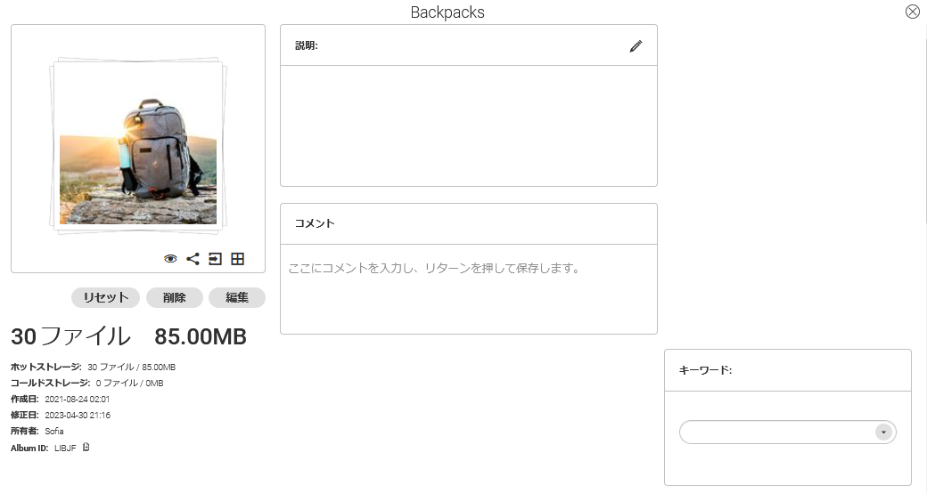 フォルダーやアルバムには、Canto の他のアセットと同様に、説明文やコメントを追加することができます。また、アルバムはカテゴリーに割り当てることができ、キーワードを使ってさらに分類することも可能です。