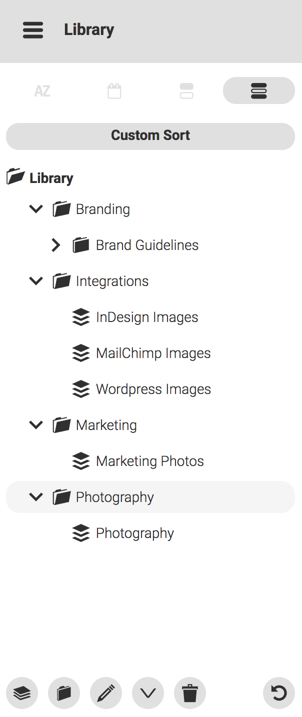 この例では、上位のフォルダを Branding、Integrations、Marketing、Photography と命名しています。これらの命名規則は、より小さく定義された部分に分解することができる概念を表しています。 特に「Integrations」は、Canto のアプリケーション内であらかじめ構築されたインテグレーション機能を利用するために、特定のアセットを対象としたアルバムを保持しています。