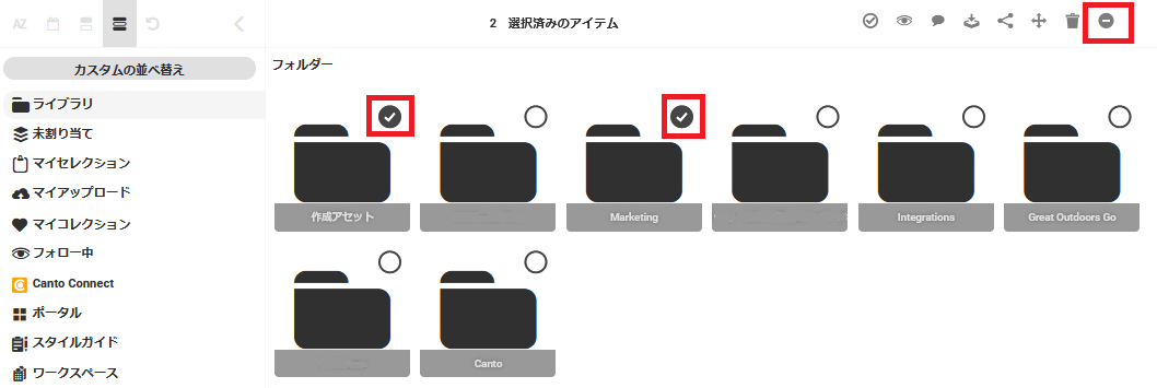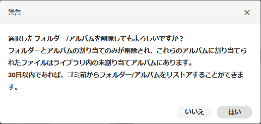 注記:削除したフォルダー内のアセット(ファイル)は削除されません。これらは「割り当てなし」状態となるか、他のアルバムに割り当てられている場合はその割り当てが維持されるため、別途削除する必要があります。