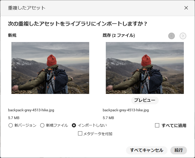 このオプションを選択すると、重複したファイルのメタデータを既存のファイルに追加するかどうかを追加で決めることができます(メタデータを付加)。