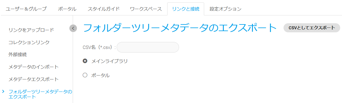ユーザーメニュー > 設定 > リンクと接続 > フォルダーツリーメタデータのエクスポート