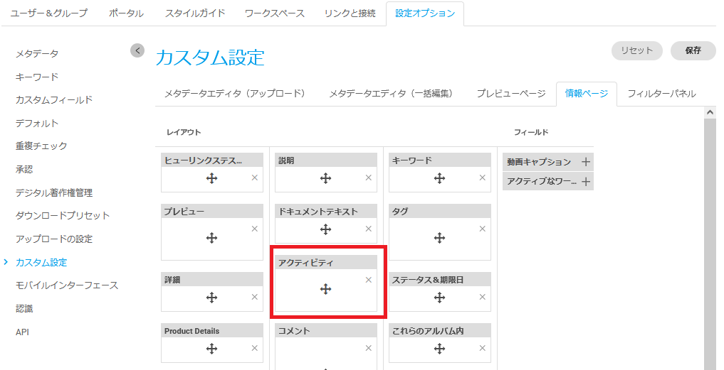追加:情報ページに追加できるパネルは、右側の「フィールド」に表示されます。
