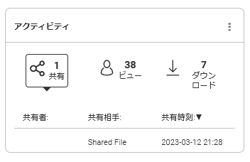 アクティビティは、「シェア」「ビュー」「ダウンロード」の3つのカテゴリーに分かれています。選択されたオプションは概要が表示されます。