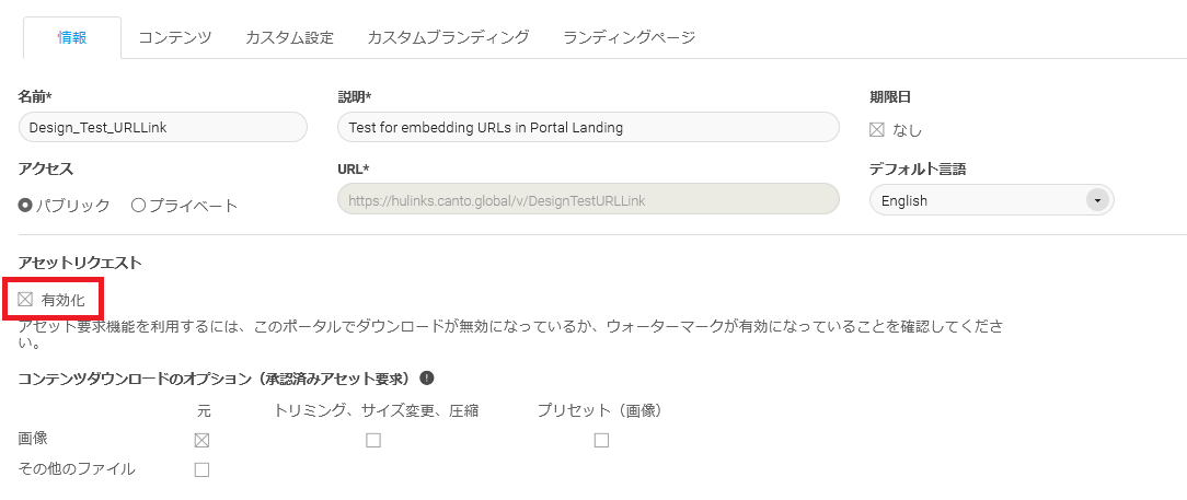 - ポータルの新規作成時、または作成済みのポータルの編集時に、アセットリクエストの設定を有効にします。