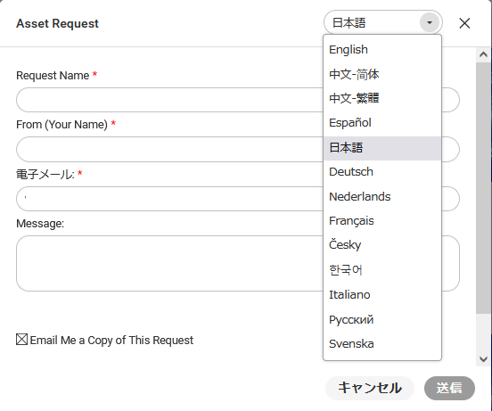 - リクエストフォームに必要事項を入力してください。ユーザーは、右上を選択することで、言語設定を調整することができます。