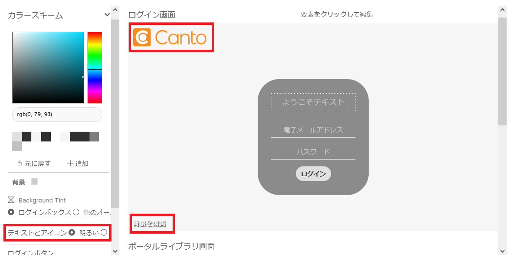 - 「ログイン画面」のプレビューの下に、「ポータルライブラリ画面」のプレビューがあります。