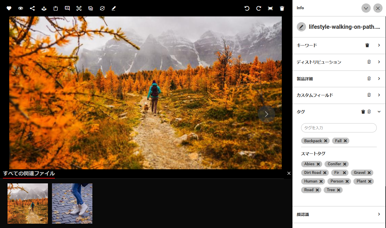 右側には、名前、説明、状態、キーワードなどの情報(メタデータ)が、それぞれ表示されます。表示をわかりやすくするために、これらのセクションは個別に階層を開閉することができます。どのメタデータを表示するかは、管理者が設定することができます。