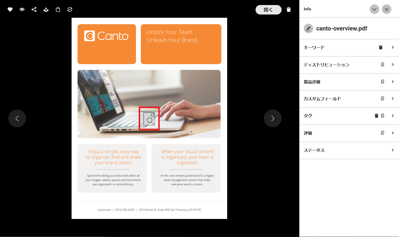- PowerPoint ファイル、PDF ファイル、Word ファイルは、ブラウザの新しいタブを開きます。これらのファイルは、プレビューの中央をクリックするか、「開く」ボタンを選択することで開くことができます。
